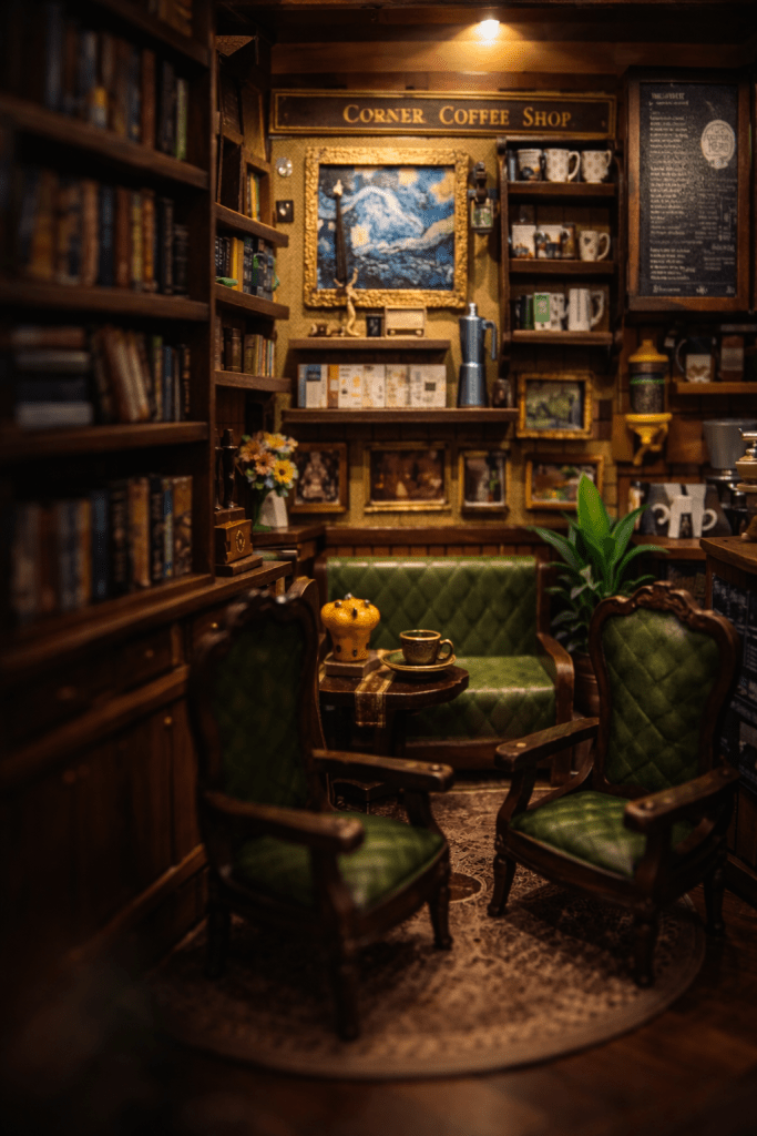 Un petit café miniature, chaleureux, presque vivant.