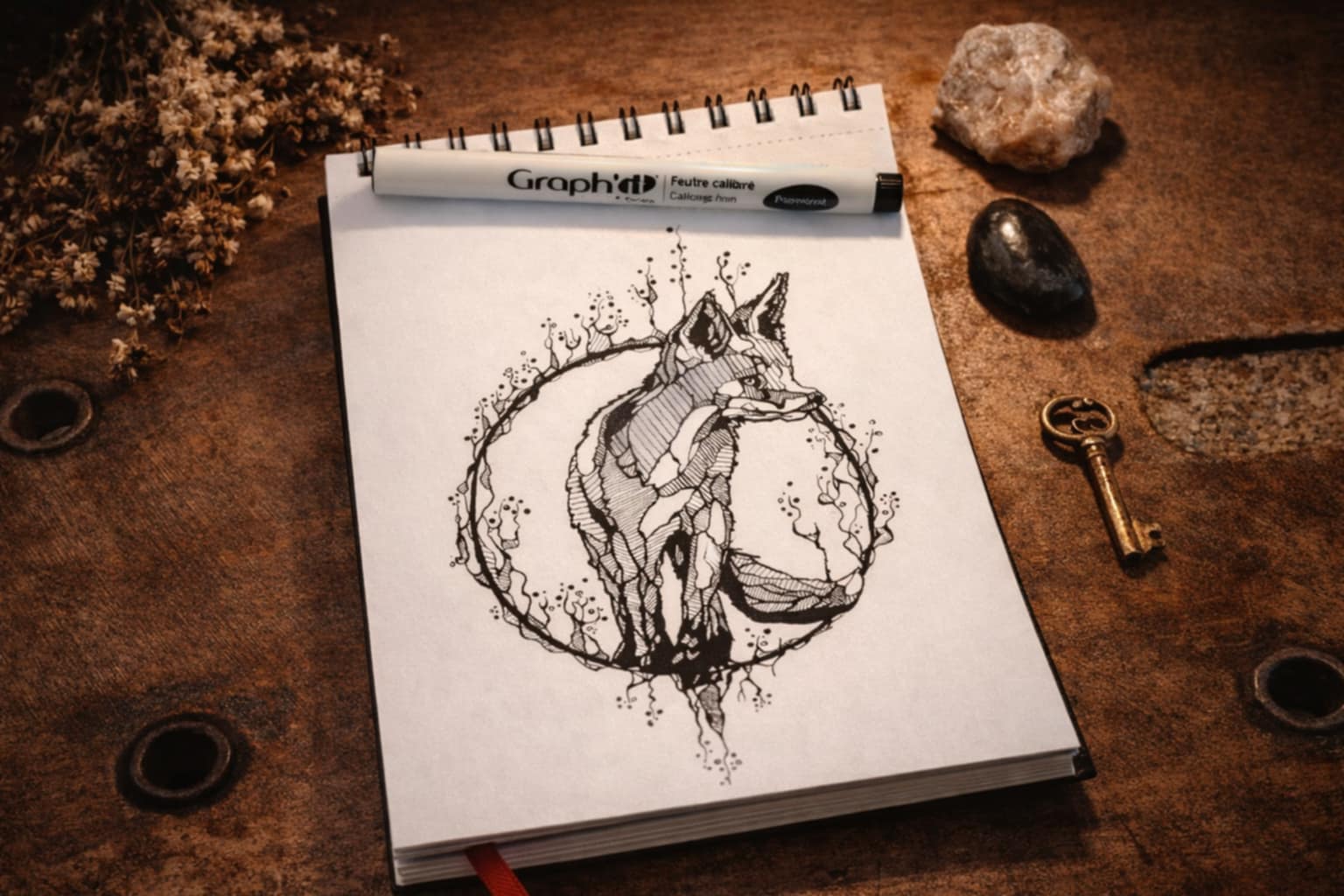 Je réalise des dessins sur mesure destinés au tatouage, aux ex libris, à l’encadrement ou à offrir. Chaque pièce est pensée comme un objet personnel, conçu avec précision et en dialogue avec vous.
